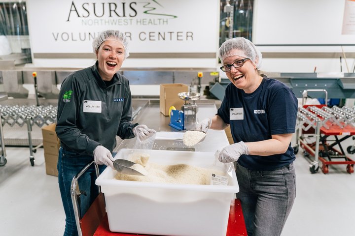 Picture a room filled with laughter, teamwork, and a shared mission. In the Volunteer Center, we pack food generously donated by farmers and food companies. We break down these bulk donations as quickly as we can to serve people facing hunger. It’s a lot of work, and it’s a lot of fun!
